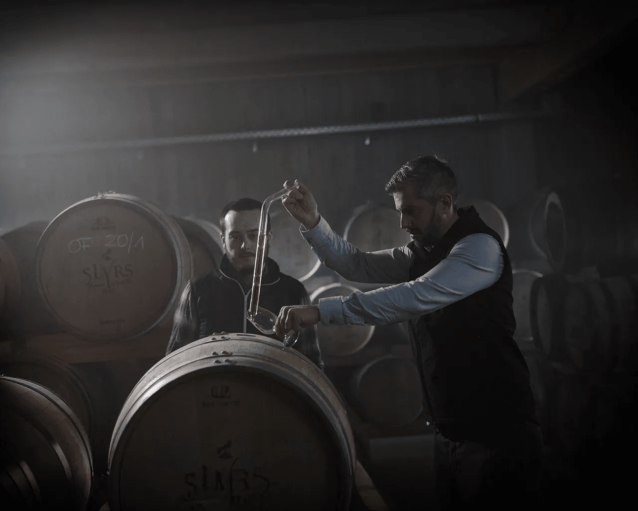 Beim Destillieren zählt nicht Schnelligkeit, sondern Feingefühl. Unsere Destillateure brennen sehr langsam und aromaschonend in traditionellen Kupferbrennblasen. So bleiben die wertvollen Aromen des Malzes erhalten und entfalten sich zu einem klaren, vollmundigen Destillat – der Essenz des SLYRS Whiskys.